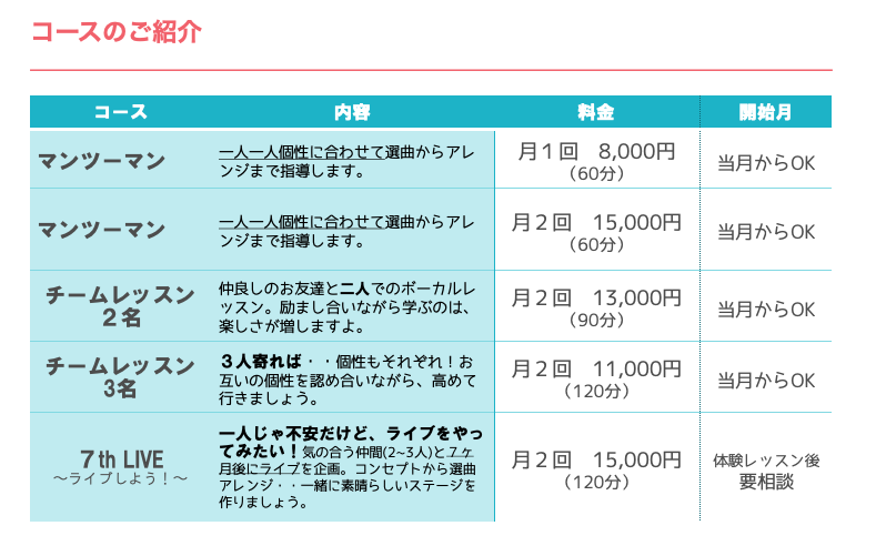 | レッスン日(月1〜2回) | 13:00〜20:00 |